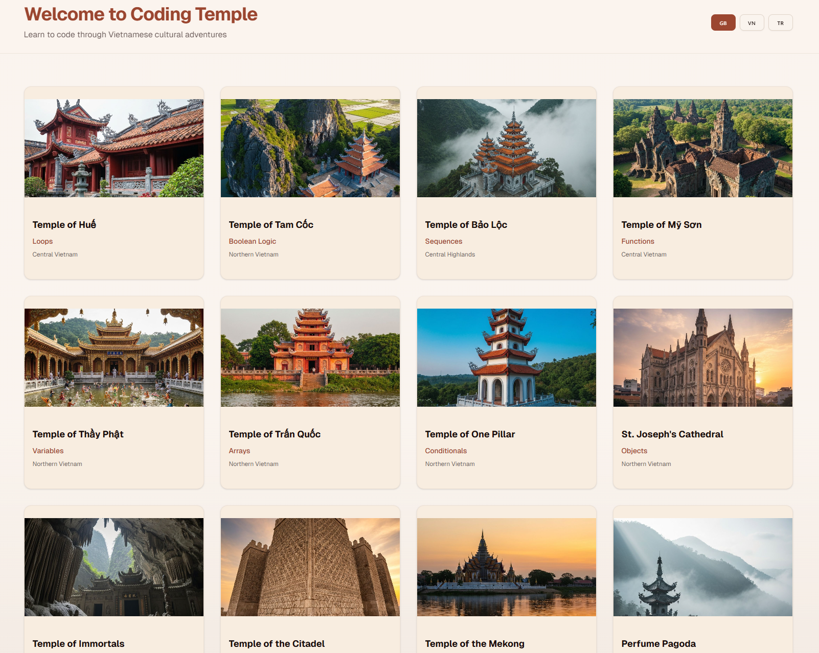 Platform planning to teach coding by having users complete coding tasks in Vietnamese temples.
